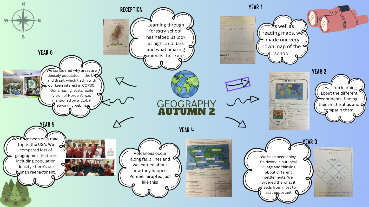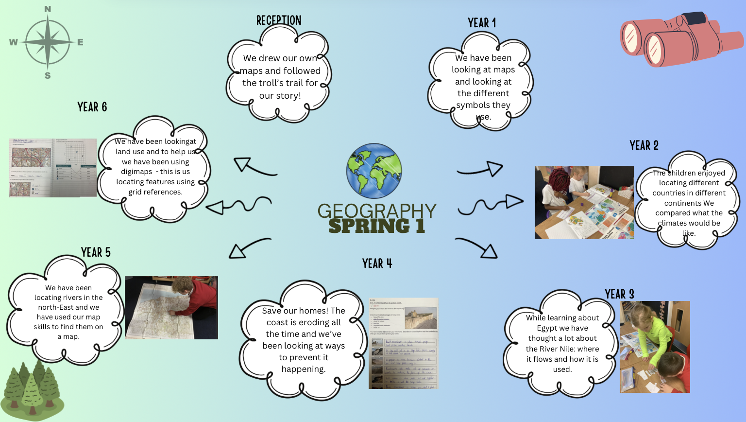 At Cotsford Primary School it is our intent that through the teaching of Geography we will broaden our children’s horizons. We follow the units of work created by Durham Local Authority. After reviewing our curriculum, we are now providing our children with the knowledge and skills required for them to develop a secure knowledge of the world around them. This is started in EYFS where the children focus on their immediate environment. It then progresses into Key Stage One where the children start to look into their own locality and the UK. By Key Stage Two, the children will be focusing on Europe and the wider world, and because our children need to develop their understanding of the world we plan appropriate trips and experiences in order to foster a respect and tolerance of the world and the people in it.
